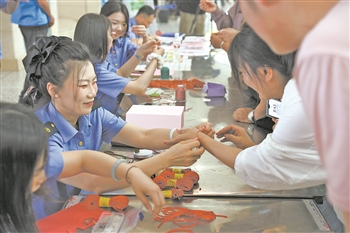 剪花剪纸剪五毒,平平安安迎端午。不少旅客围坐在哈尔滨站候车大厅的长桌旁,体验传统民俗。剪刀裁纸沙沙作响,不一会儿,栩栩如生的剪纸就摆满了桌面。